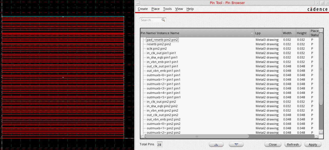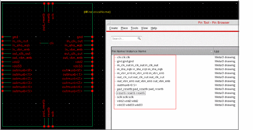 The following image shows the new pins and rails that are generated in the layout design and are listed in the Pin Tool. The newly created pin and rail names are appended with _<pin_number> suffix. The pins are placed in the same sequence as in the symbol view.