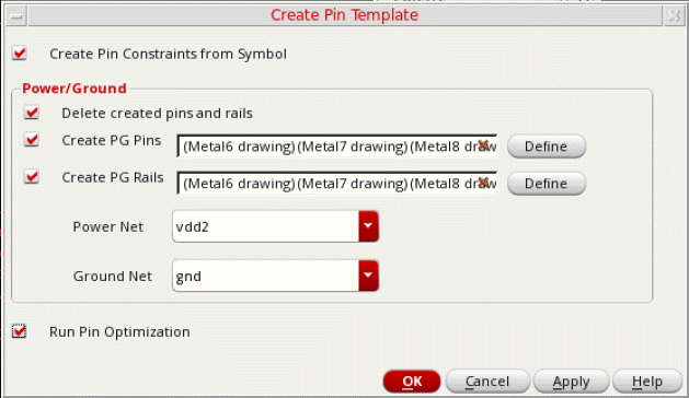 - In the Power/Ground section, new power and ground pins are created if the corresponding options are selected. If not selected, then all power and ground pins in the layout are deleted.