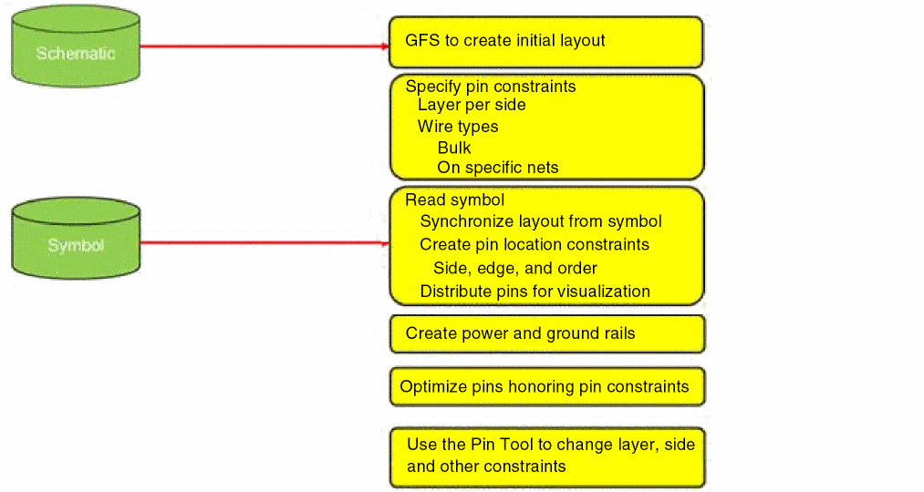 The tool reads pin positions and pin constraints from the source view and checks for the presence of corresponding pins in the target view and then synchronizes them. The Create Pin Template tool creates missing pins and renames, repositions, and constrains existing pins in the layout view as per the source view. Power and ground pins and rails are generated and the Pin Optimizer is run, thus making the design ready for further placement and routing.