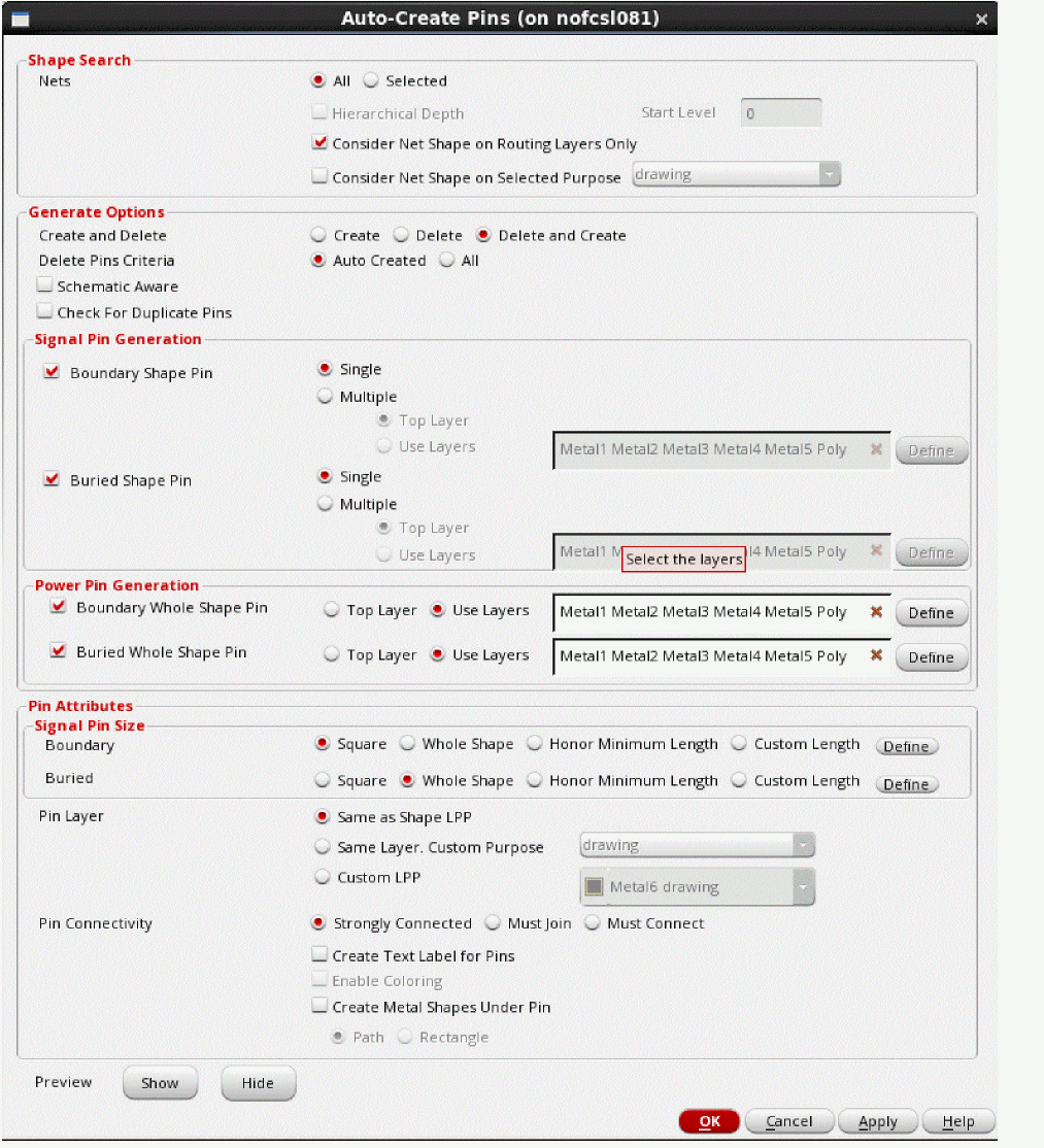 The Auto-Create Pins form provides options to search for net shapes in a design and create boundary and buried pins automatically on these net shapes.