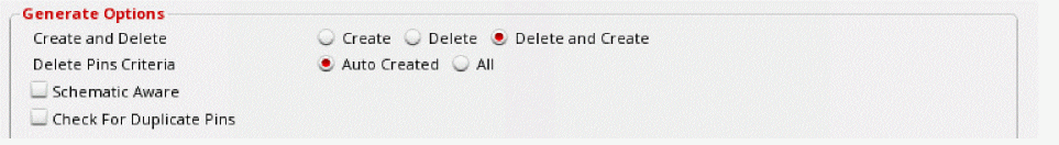 In the Generate Options section, select Create and Delete to delete all pins that were created by the Auto-Create Pins tool, create pins hierarchically, and promote them from a lower level to a higher level.