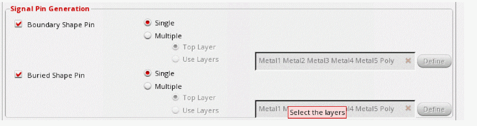 Set Signal Pin Generation to either one or both options: Boundary Shape Pin and Buried Whole Shape Pin.