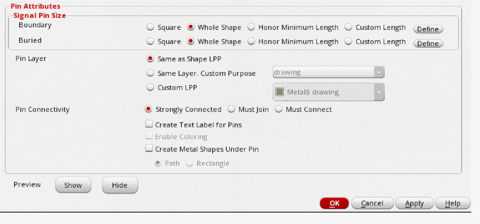 In Signal Pin Size section, you can set the pin size for Boundary and Buried pin shapes to Auto, Whole Shape, Honor Min Length, or Custom Length and create square pins or custom sized pins as per underlying shape or
