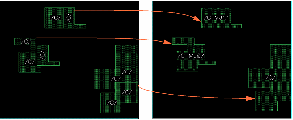 The following example shows how overlapping pins that belong to the same layer and are connected to the same net, net C, are merged.