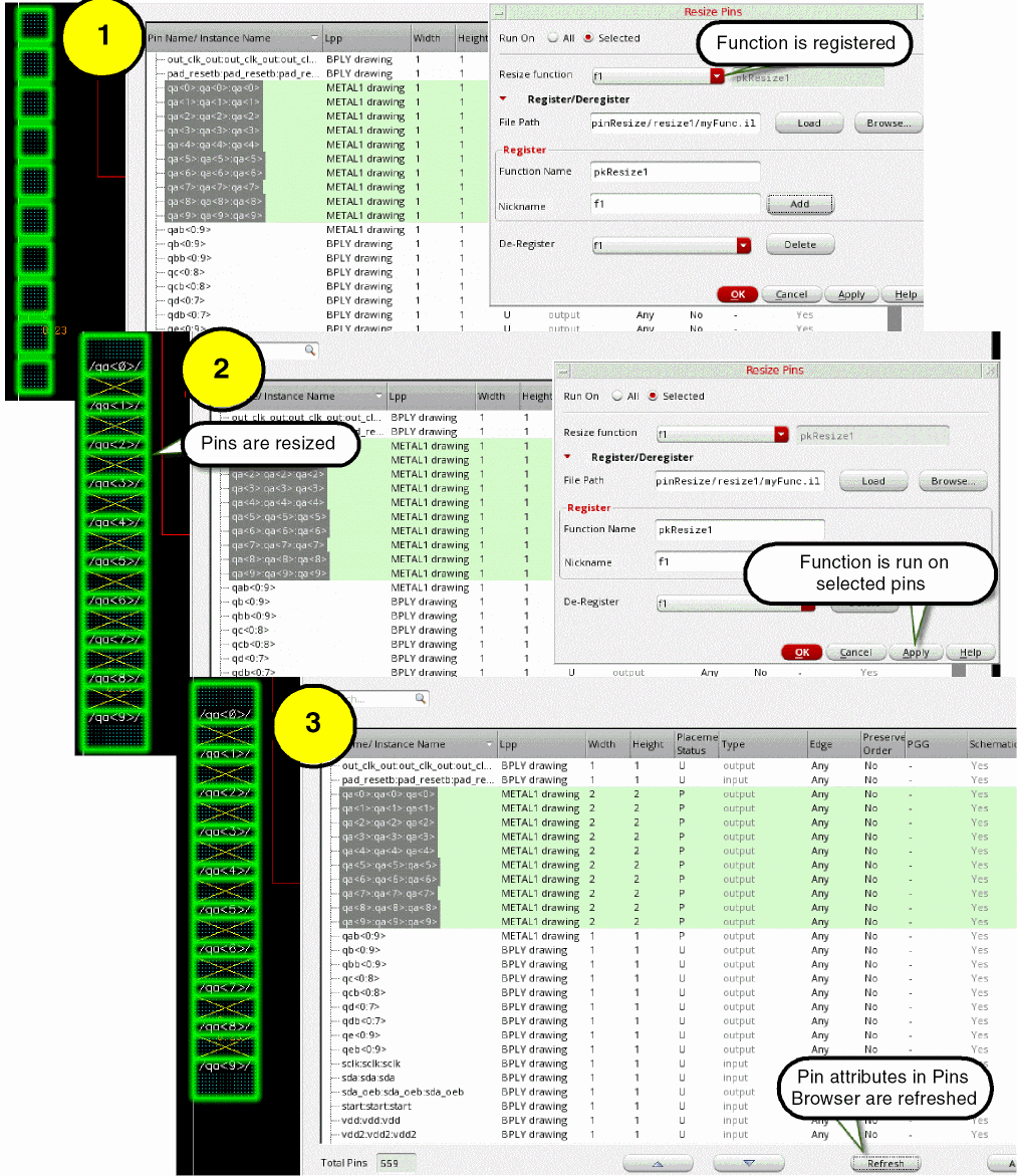 Click Apply to run the selected function. The pins in the design view are resized. - In the Register/Deregister section, you can register a pin resize estimator or SKILL function. Specify the File Path of the SKILL hook procedure file that contains the pin resize definitions. Alternatively, click Browse to select the required file and close the window.