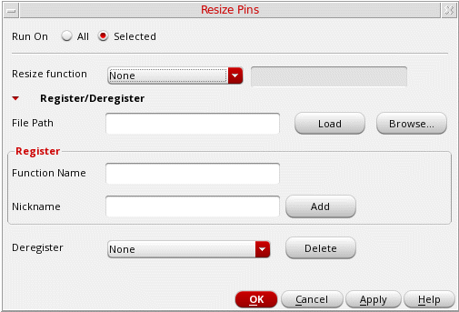Use the Resize Pins form to register, run, or deregister the pin resize estimator SKILL functions.