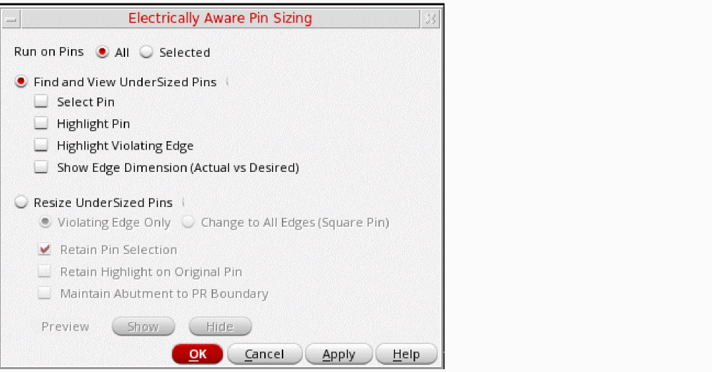 The Electrically Aware Pin Sizing form appears. - Select one of the following Run On Pins options to specify the pins on which the command has to run. Choose All (default) to run the command on all top-level and level-1 pins in the design. or choose Selected to run the command on the selected pins.