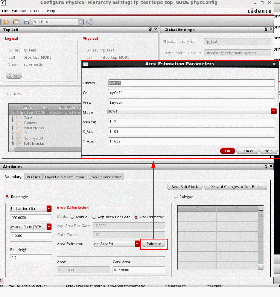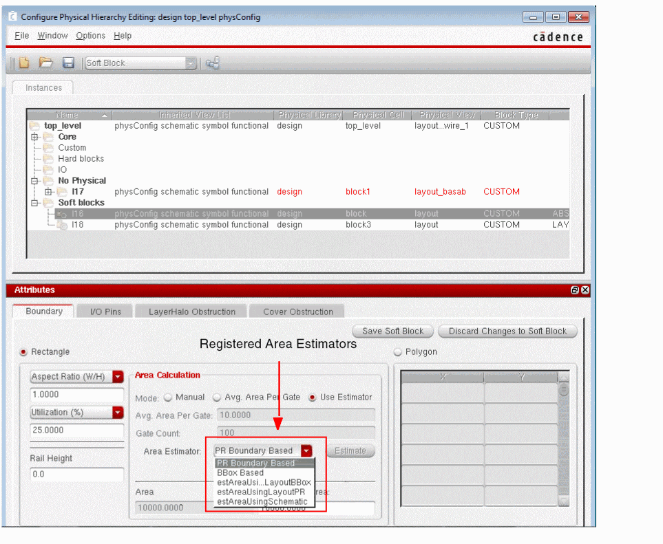 The area estimation framework in Floorplanner lets you analyze an acceptable area utilization percentage and derive the size of a rectangular area boundary for a cellview or virtual hierarchy. To do this, you define your own area estimation function. You can directly type the area estimation function in the CIW or define it in the .cdsinit file. You can register an area estimation function using the leRegAreaEstimator SKILL function. The area estimation function can be called using the Area Estimation Parameters form in Configure Physical Hierarchy (CPH) window. The registered area estimator registration function is displayed in the Area Estimator drop-down list in the Boundary tab of the CPH window in Soft Block mode.