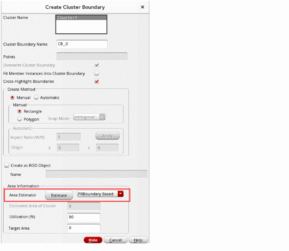 Cluster boundary defines an area in which the contents of a specific cluster are included or excluded, depending upon their definitions. A cluster boundary is attached to a specific cluster object. Each cluster boundary has a unique name with respect to all other cluster boundaries in a given cellview. You can specify the percentage of area within the cluster boundary you want to fill in Layout XL. A registered area estimation function can be called from the Create Cluster Boundary form.
