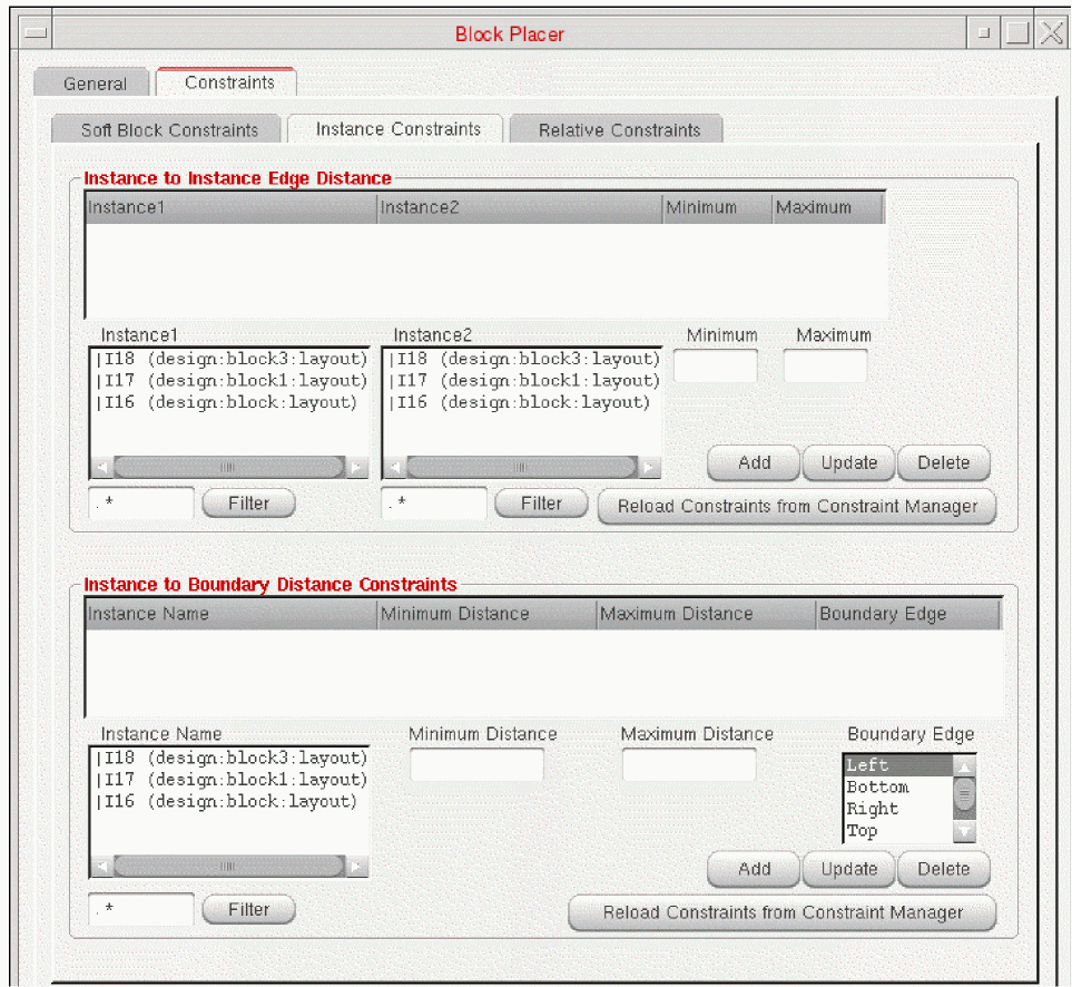 You can add, update and delete the side constraints for soft blocks using the Instance Constraints tab present in the Constraints tab of the Block Placer form.