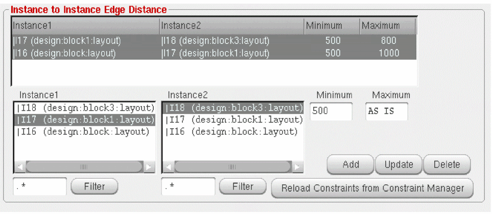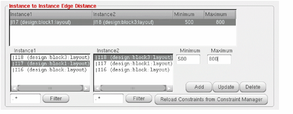 If the values you specify violates the distance constraint in the Constraint Manager, a warning message is displayed in the CIW. In addition, if you specify only the minimum value, the maximum distance will be equal to the maximum width and height of the chip. Similarly, if you specify only the maximum value, the minimum distance will be zero.