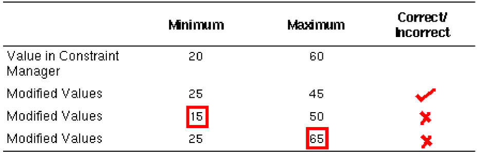 For example, if the distance constraint between two instances Instance1 and Instance2 in the Constraint Manager are specified as 20 and 60, you can specify the minimum and maximum distance values between 20 and 60. This means that the minimum distance that you specify should not be less than 20 units and the maximum distance should not be more than 60 units. The table below lists some of the possible incorrect values.