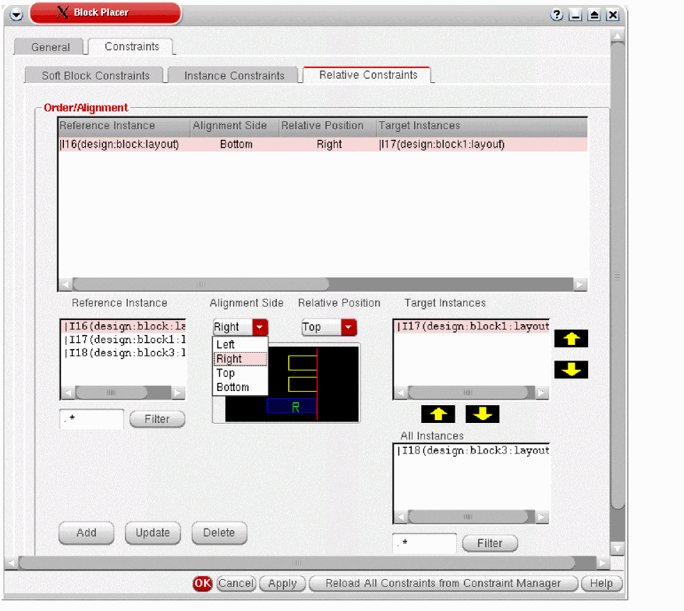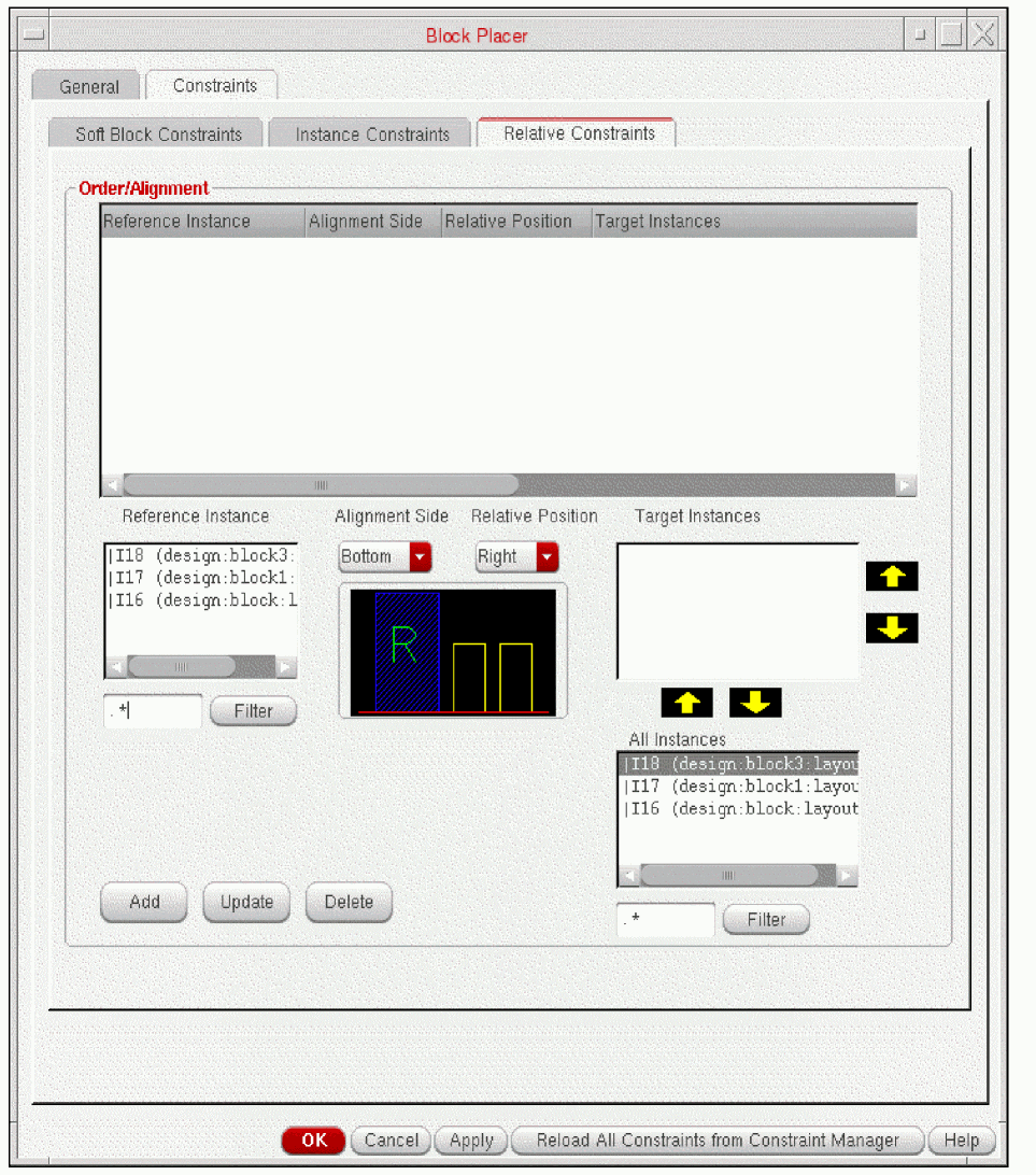 Block placer respects the order and alignment constraints for blocks specified in the table in the Order/Alignment section. The order and alignment constraints use Reference Instance, Target Instance, Alignment Side, and Relative Position parameters.