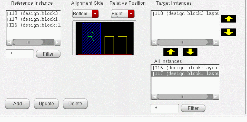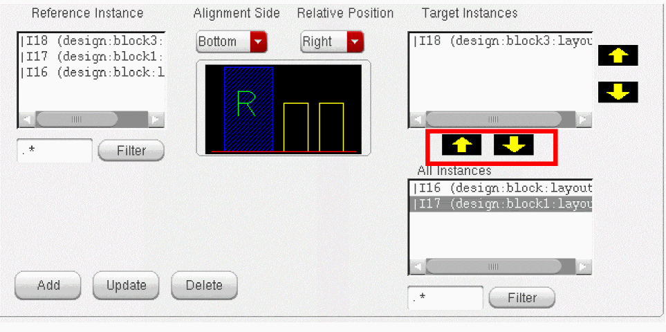For example, if you specify the alignment side as Left, then the target instances can be placed either on top or bottom of the reference instance. You can specify top or bottom by using the Relative Position field.
