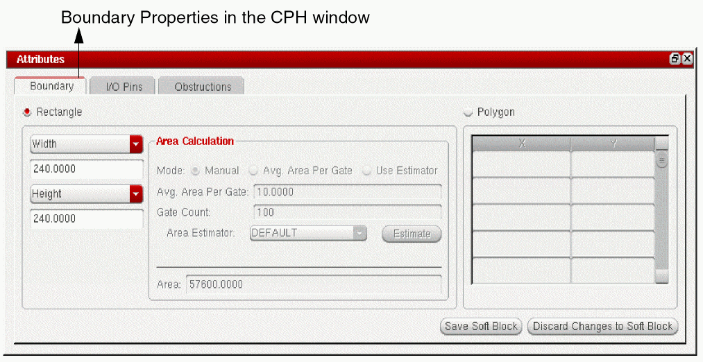 A floorplan property file is an extension used to store the configurable parameters of a floorplan and reuse those parameters to configure a new design. These properties are used to create soft blocks for the instances in the physical hierarchy. The master properties are defined in the Configure Physical Hierarchy (CPH) window when you select the soft block option. The properties that are defined is displayed in the following figure.
