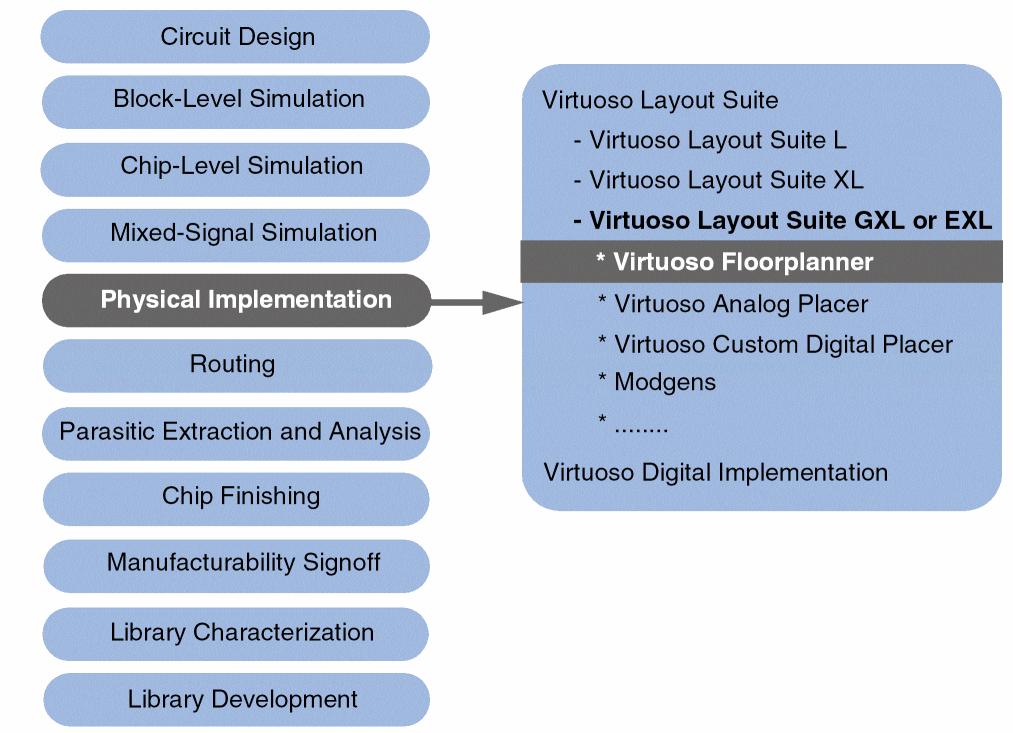 The following diagram shows how Virtuoso Floorplanner fits in the overall Virtuoso design flow.