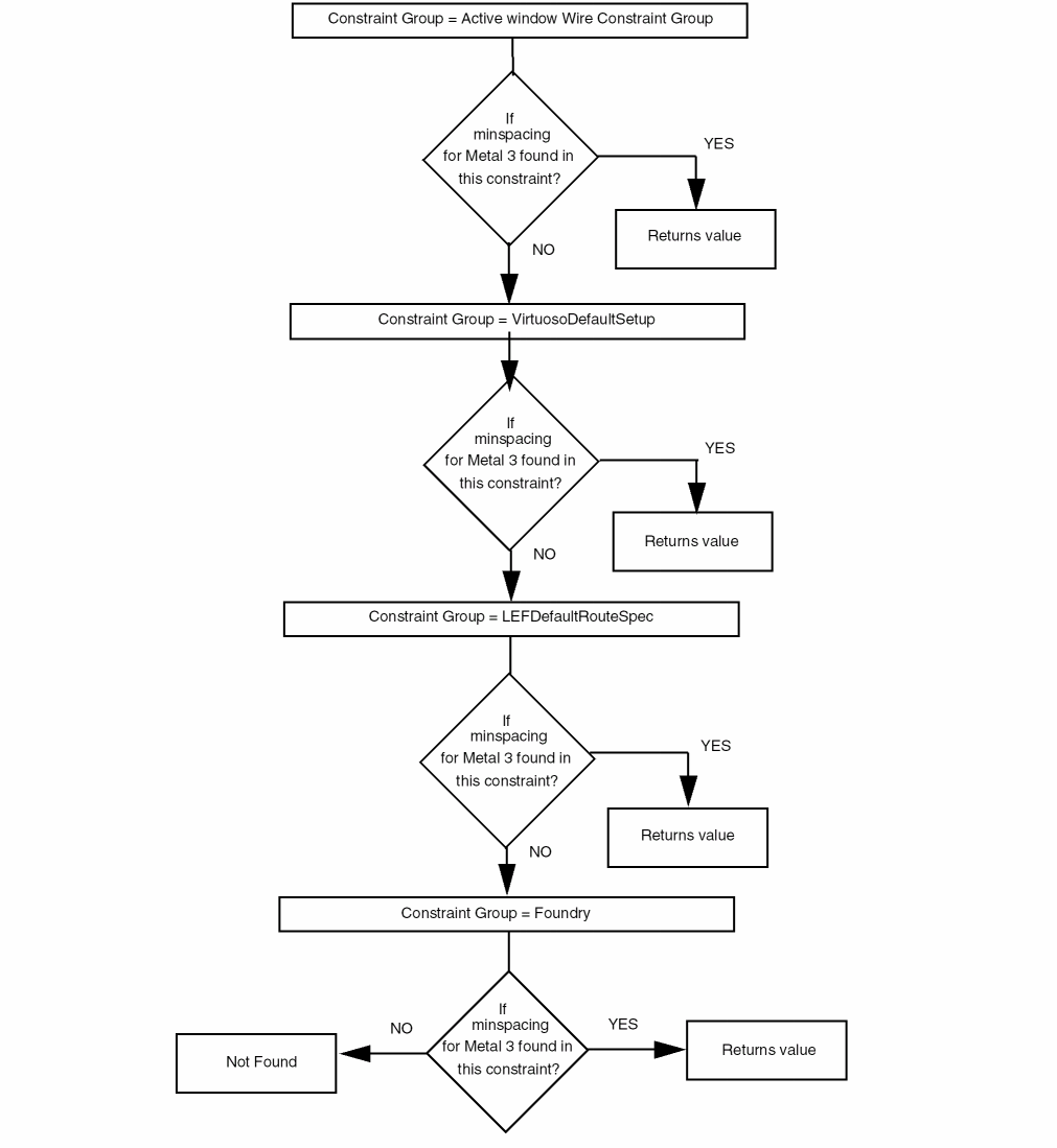 For example, during reinitialization, if the minSpacing value for metal3 is required, Floorplanner searches the minSpacing value in the Active Window Wire constraint group. If the minSpacing value is found in the Active Window Wire constraint group, it is used. Floorplanner then searches for the minSpacing value in virtuosoDefaultSetup and then LEFDefaultRouteSpec and if still not found then in foundry.