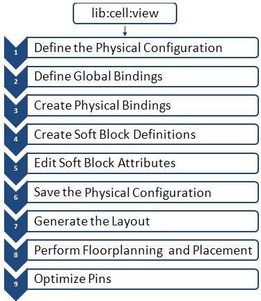 The first step in the design flow is to define a physConfig by using the lib:cell:view of the layout and schematic as parameters. A unique physConfig ID is returned. In the following code, the physConfig ID for the top-level soft block is assigned to variable cphId.