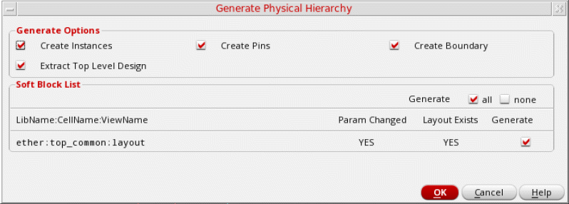 After generating the physical hierarchy, for a few soft blocks, a few extra pins may be generated in the layout view. Usually, these are power and ground pins that were not visible in the logical hierarchy of the design. Generate Physical Hierarchy promotes these pins to the top of each soft block while generating their layout views. Use the options in the Edit – Soft Blocks form to update the parameters for these pins.