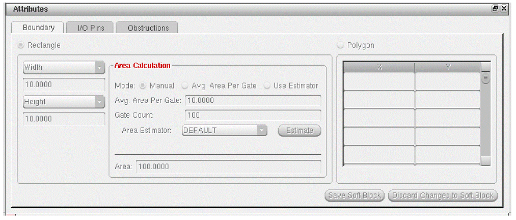 You can also specify the attributes, such as boundary, IO pins, and obstructions, for each soft block and soft abstract in the Attributes section of the Soft Block mode. While defining soft blocks in the CPH form, the pin layer will be read from the intIOPinLayer environment variable, which corresponds to the I/O Pins tab. Following is the syntax to set the environment variable.