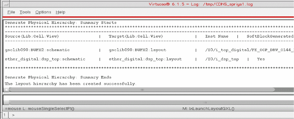 A summary report of the soft blocks generated by Generate Physical Hierarchy is displayed in the CIW. The summary report displays a table that lists the source lib:cell:view name, the target lib:cell:view name, the instance name, and the status of whether the soft block has been generated.