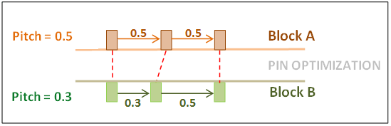 Consider pins in two separate blocks, Block A and Block B. The pitch for pins in these blocks is different. During pin optimization, the pins are placed such that: