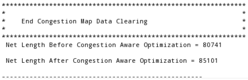 Running Pin Optimizer in the congestion-aware mode may result in an increase in total net length, which is expected because target pins might be placed further away. This is done to increase the routability of the design without increasing the design size or modifying the block locations.