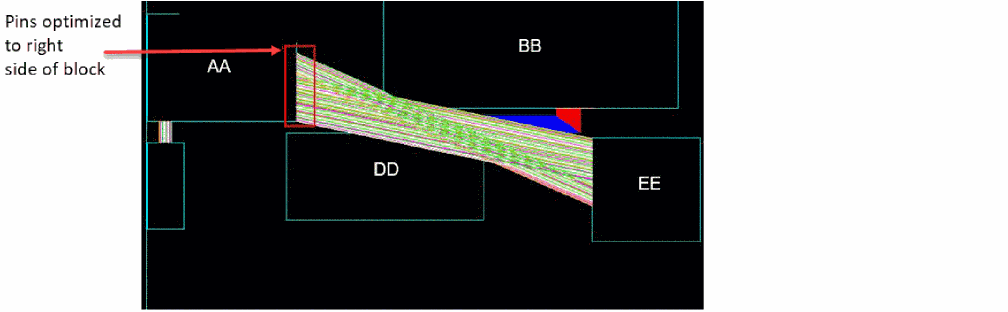 The following example shows how congestion-aware pin optimizer helps with pin placement. Pin Optimizer internally uses the results from Global Router to find congestion-aware placement positions for pins and places the pins accordingly.