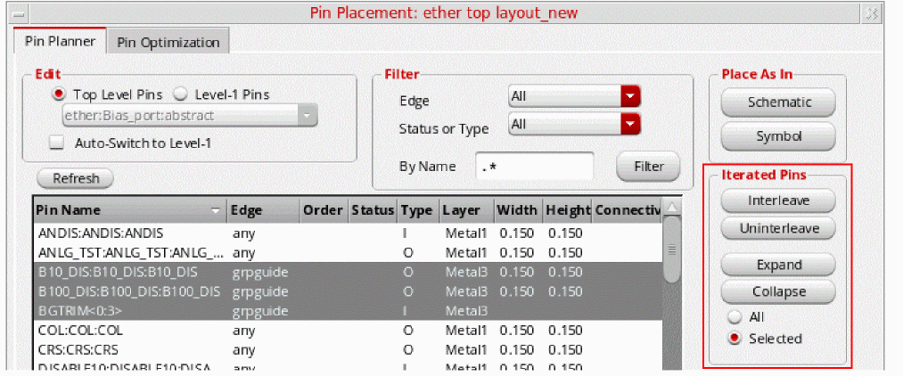 Use the Interleave button of the Pin Placement form to interleave the bits of the selected iterated pins and automatically apply an order constraint to constrain how the individual bits will be placed.