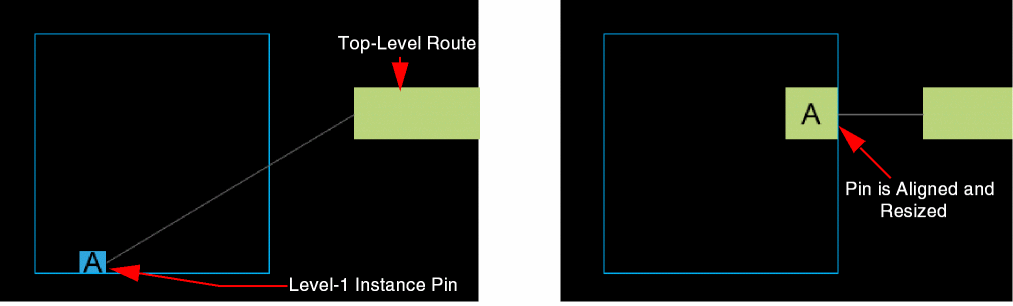 Pin Planner lets you align level-1 instance pins with the top-level routes to which they are connected. You can also choose to resize the pins to match the dimensions of the corresponding top-level route, as shown in the following diagram: