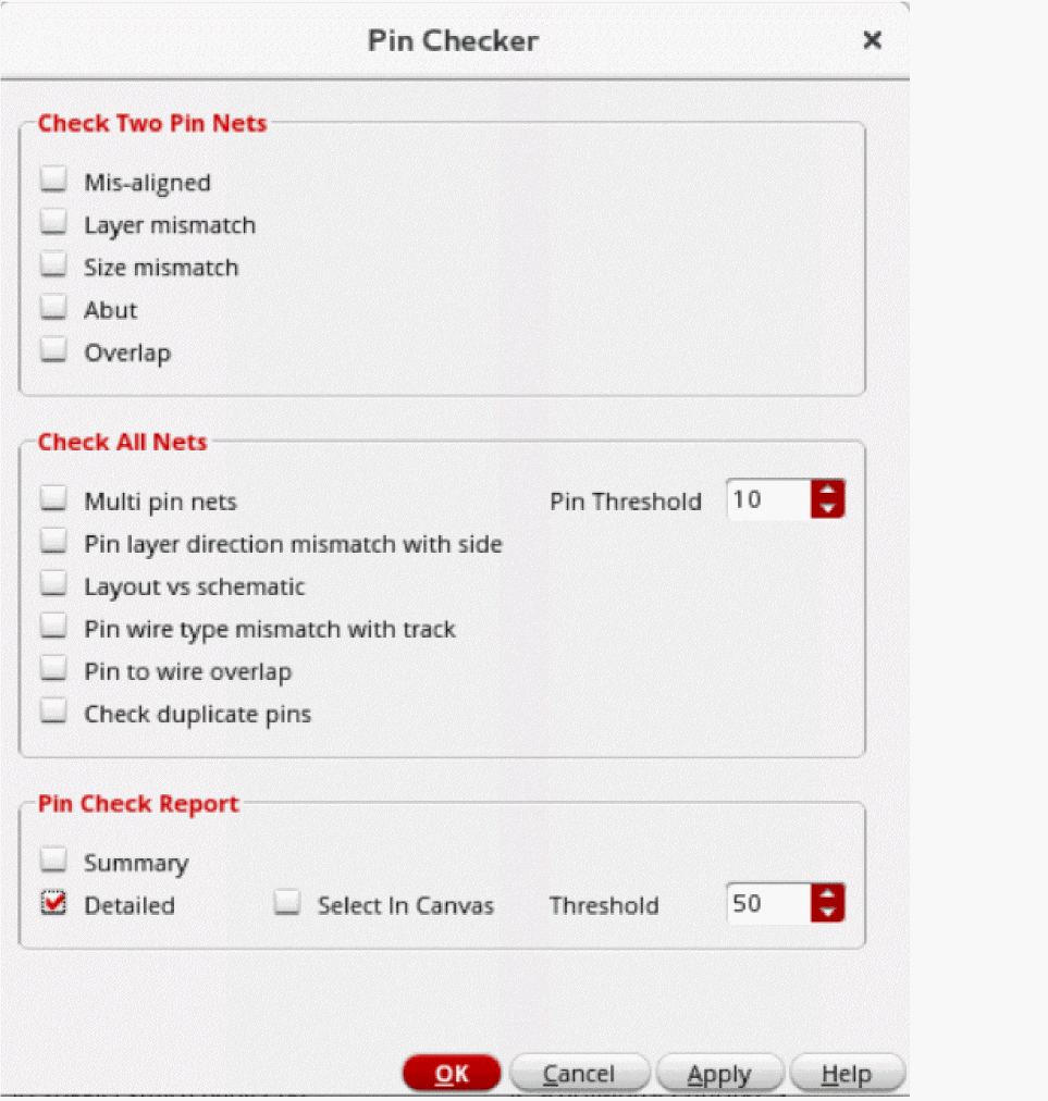 In the Check Two Pin Nets section, the options are applicable only to the nets that are connected to two pins. Violations are reported in the Pin Check Report.