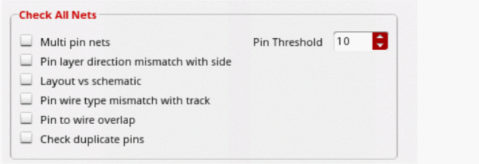 In the Check All Nets section, the options are applicable to all nets and the violations are reported in the Pin Check Report.