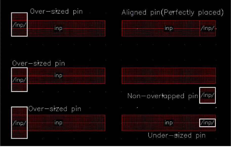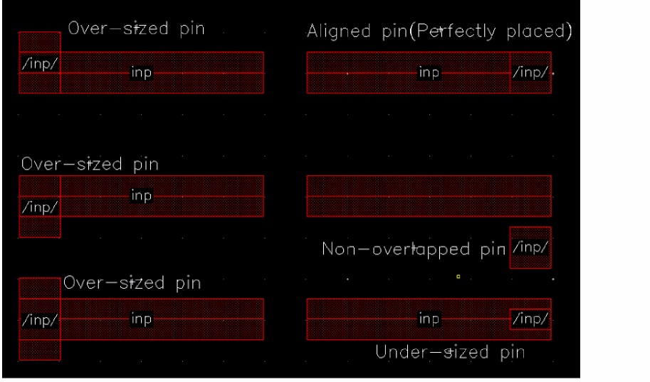 Select Pin to wire overlap to check if there is any physical overlap of pins with the wire. The figure below shows that the pins can be aligned on wires or be in violation as under-sized, over-sized, or non-overlapping.