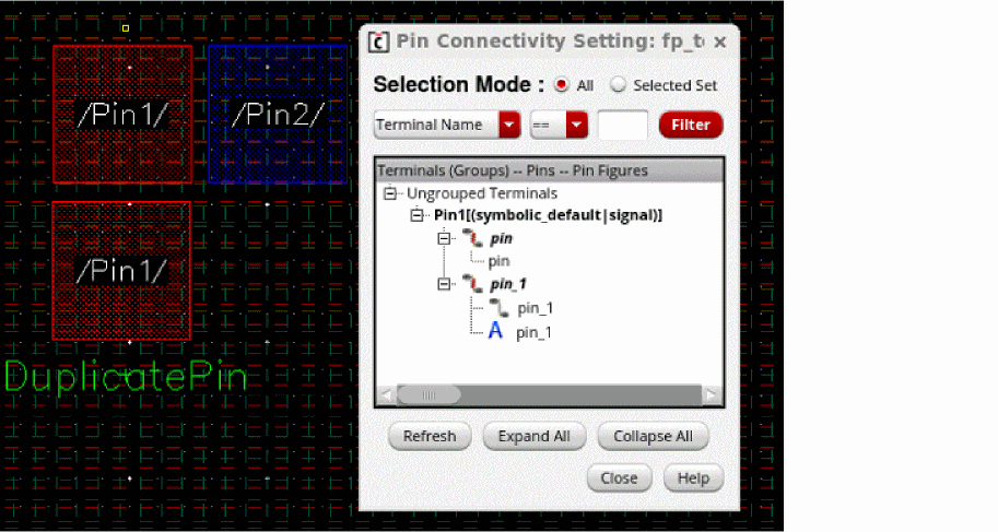 Select Check duplicate pins to check for pins with the same terminal, pin, and fig name. The figure below shows that the figure name, pin name and terminal name is same for