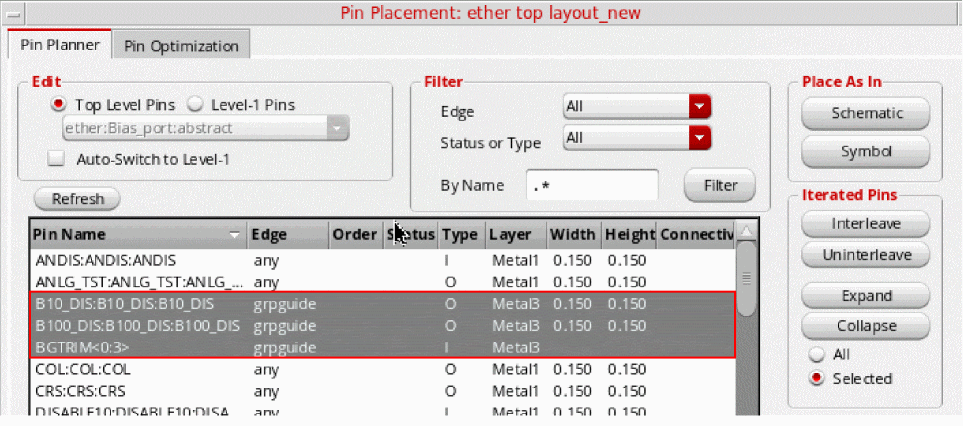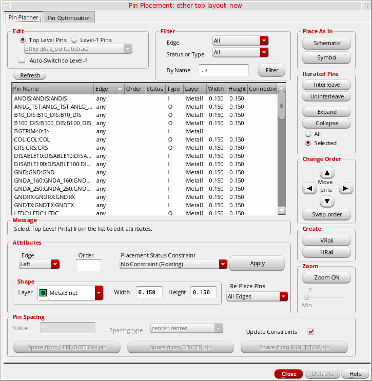 Choose either Floorplan – Pin Planner or Floorplan – Pin Optimization command to open the Pin Placement form.