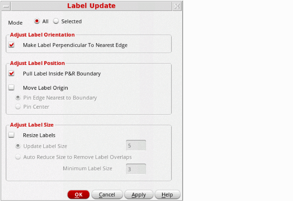 - Select All to run on all soft block pin labels and text displays in the current design.