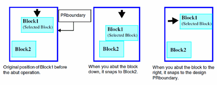 Moves the selected block in the specified direction until it abuts another block or the PR boundary. Similarly, you can use this option to move and abut pins in the specified direction. When you abut a soft block, the soft block does not overlap another block or move off the design PR boundary.