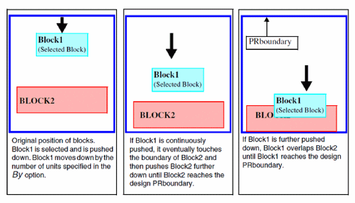 Moves the selected block or pin in the specified direction by the number of units you specify in the By option. The Push option does not check for overlapping blocks or pins, but does not move off the design PR boundary. Each time you click an arrow icon, the selected block moves in the specified direction until it reaches the design PR boundary. If it abuts another block, it pushes the block as well until the adjacent block reaches the PR boundary. If you continue to further push the block in the same direction, the selected block overlaps the adjacent block until the selected block reaches the design PR boundary, as shown in the graphic. A similar behavior is observed when the command is run on a selected pin.