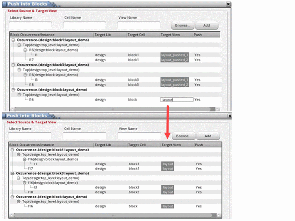 If there are multiple occurrences of the same master in the hierarchy, on adding the block it populates unique target views in the tree with Target View name set to layout_pushed_1, layout_pushed_2 and so on. You can also append the hierarchical path to the view names using the Auto Suffix Occurrence Path checkbox.