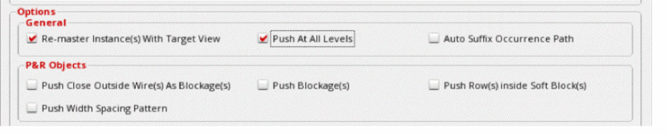 - In the Options – P&R Objects section, select Push Close Outside Wire(s) As Blockage(s) to push the pre-route objects that do not overlap the soft block, but are in close proximity into the selected soft block instance.