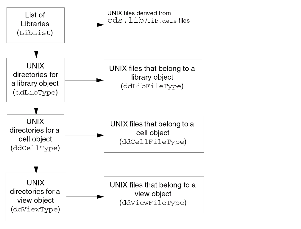 The following table shows the design data (DD) ID types of the objects that correspond to the libraries, cells, views, and the files contained in them.