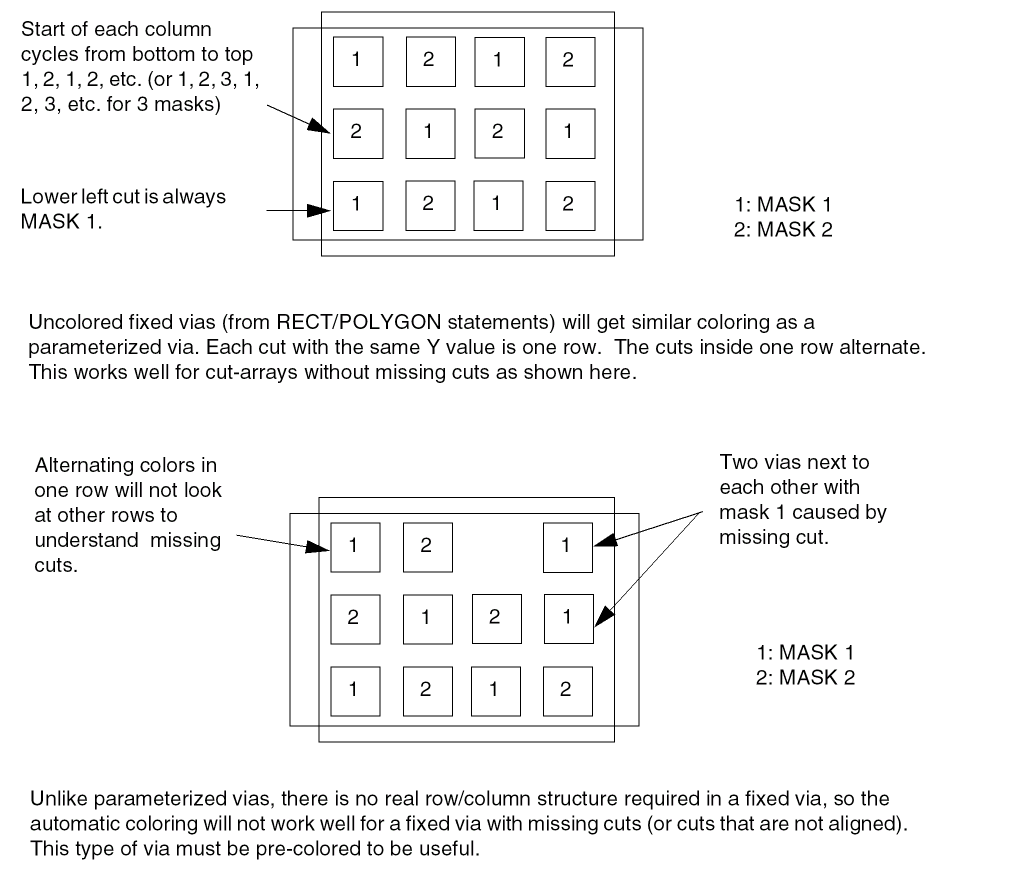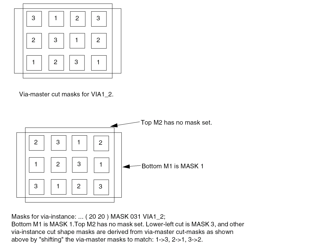 For uncolored fixed vias, or parameterized vias (with + VIARULE ...), the mask of the cuts are pre-defined as an alternating pattern starting with MASK 1 at the bottom-left. The mask cycles, from left-to-right and bottom-to-top, for the cuts are as shown in Figure 6-19.