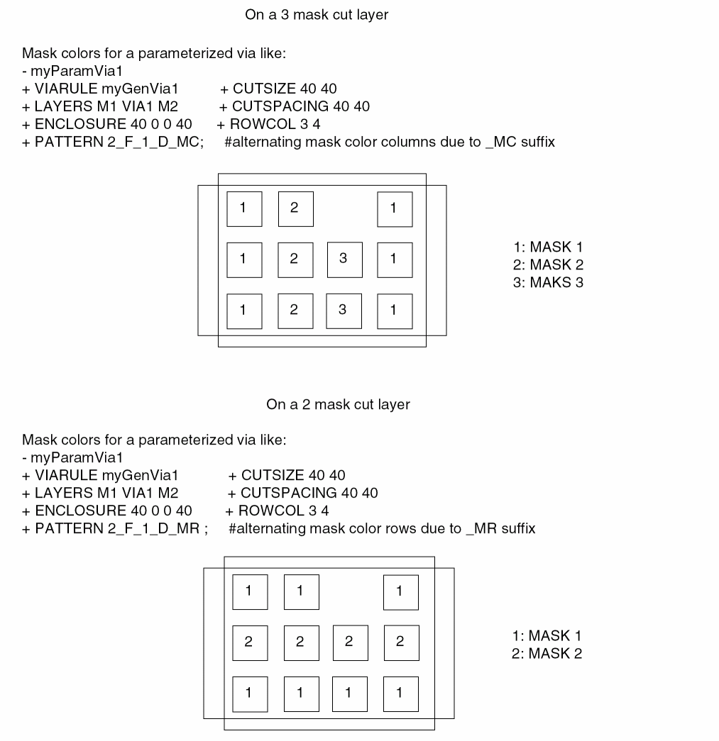 The following examples show a parameterized via with cut-mask patterns for a 3-mask layer and 2-mask layer using _MC and _MR suffixes: