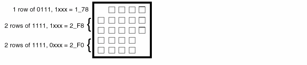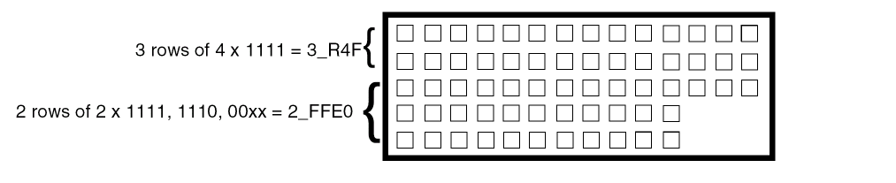 The R4F value indicates a repeat of four Fs. The last two bits of each row definition are ignored because only 14 bits allowed in each row.