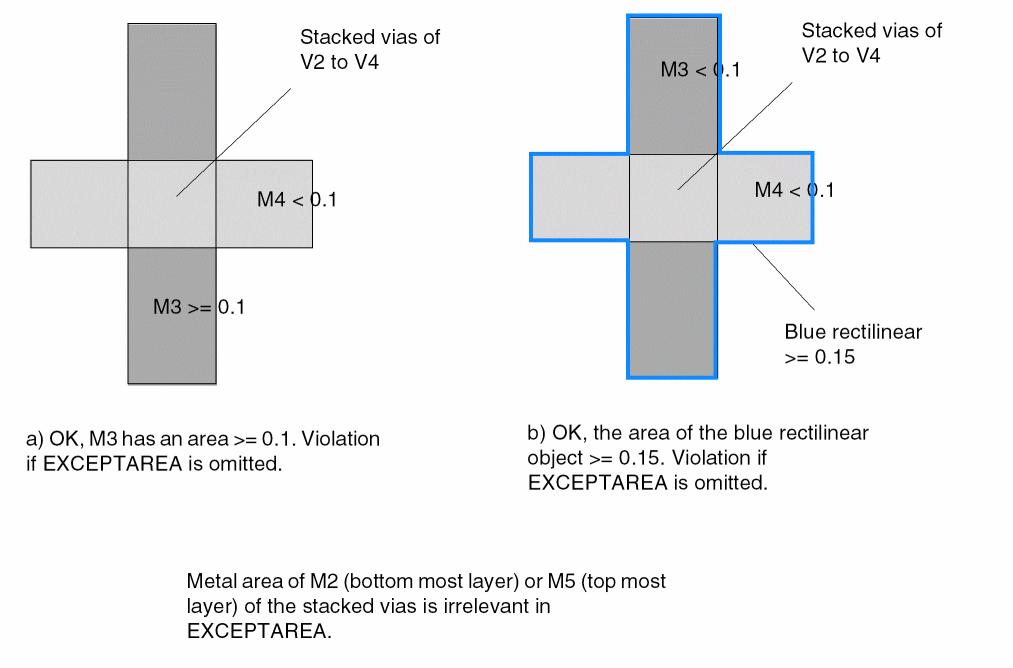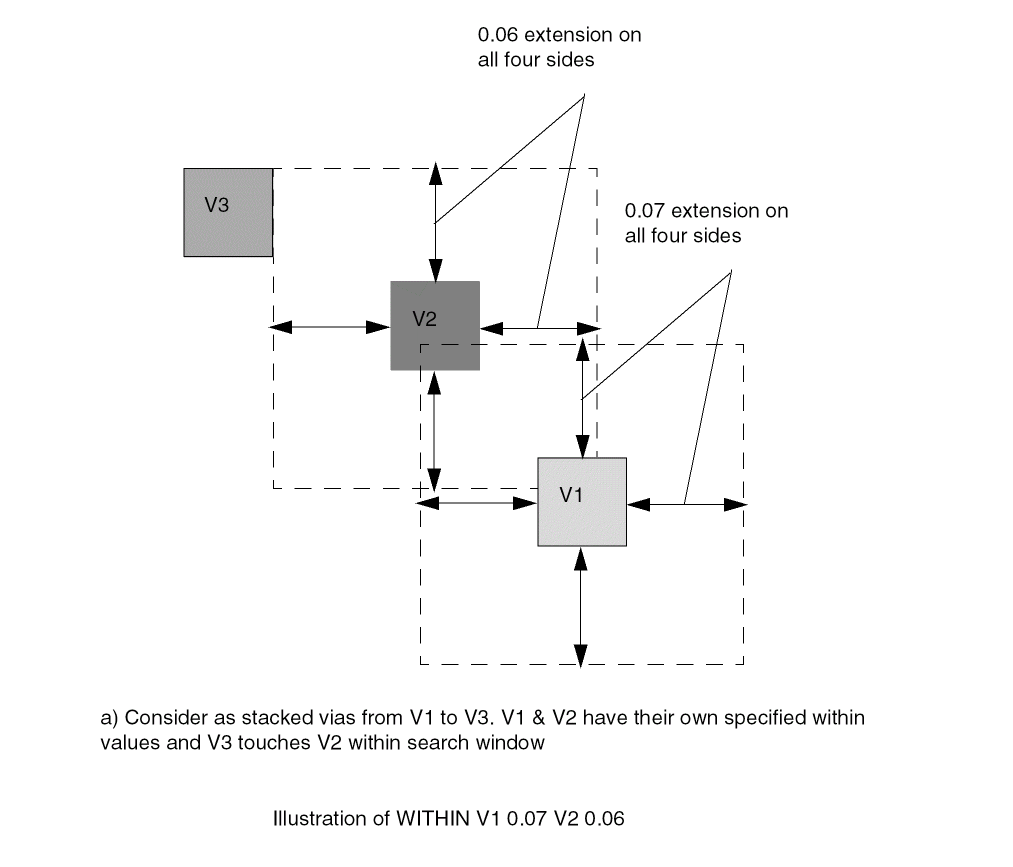 For example, VIARULE GENERATE ENCLOSURE 0.2 0.0 combined with a LAYER CUT rule of ENCLOSURE 0.2 0.0, ENCLOSURE 0.1 0.1 and ENCLOSURE 0.15 0.15 WIDTH 0.5, would mean that any via inside a wire with width that is greater than or equal to 0.5 wide, 0.15 0.15 enclosure values are used. Otherwise, 0.2 0.0 enclosure values are used. See the LAYER CUT ENCLOSURE statement for more information on handling multiple enclosure rule.