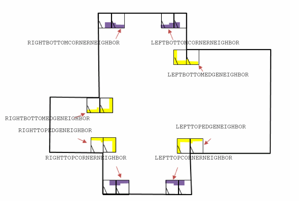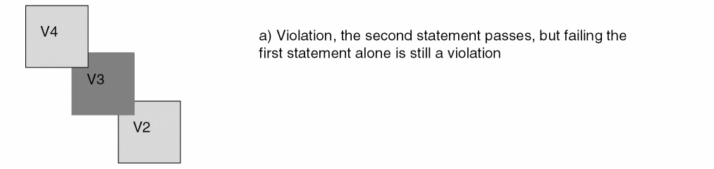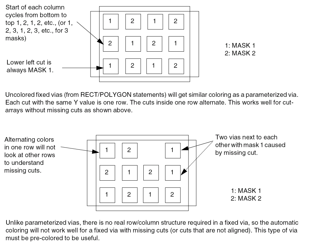 For a fixed via made up of RECT or POLYGON statements, the cut shapes must all be colored or not colored at all. If the cuts are not colored, they will be automatically colored in a checkerboard pattern as described above for parameterized vias. Each via-cut with the same lower-left Y value is considered one row, and each via in one row is a new column. For common "array" style vias with no missing cuts, this coloring is a good one. For vias that do not have a row and column structure, or are missing cuts this coloring may not be good (see Figure 1-62). If the metal layers having only one shape per layer are not colored, some applications will color them to MASK 1 for internal consistency, even though the via-master metal shape colors are not really used by LEF/DEF via instances. For multiple disjoint metal shapes, it is highly recommended to provide proper color.