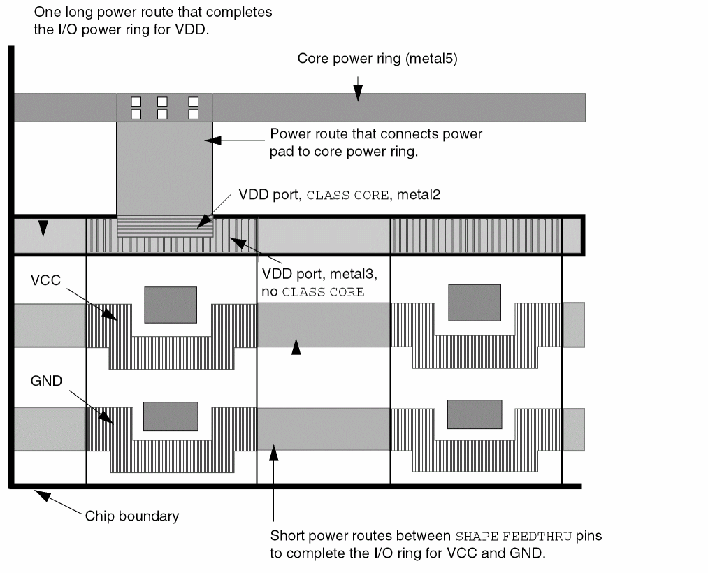 VIARULE GENERATE statements to create a via for the intersection of two special wires. In earlier versions of LEF, VIARULE GENERATE was not complete enough to cover all situations. In those cases, a fixed VIARULE (without a GENERATE keyword) was sometimes used. This is no longer required.Example 1-26 Via Rule Statement
