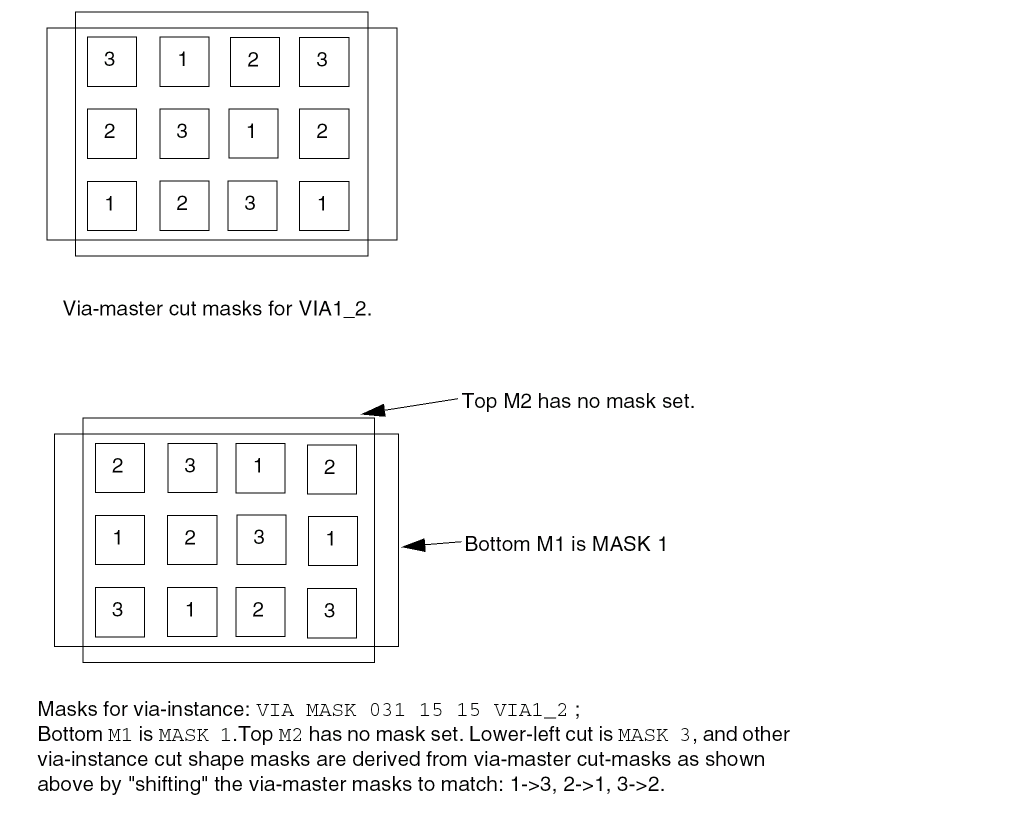 - The following examples show a parameterized via with cut-mask patterns for a 3-mask layer and 2-mask layer using _MC and _MR suffixes: