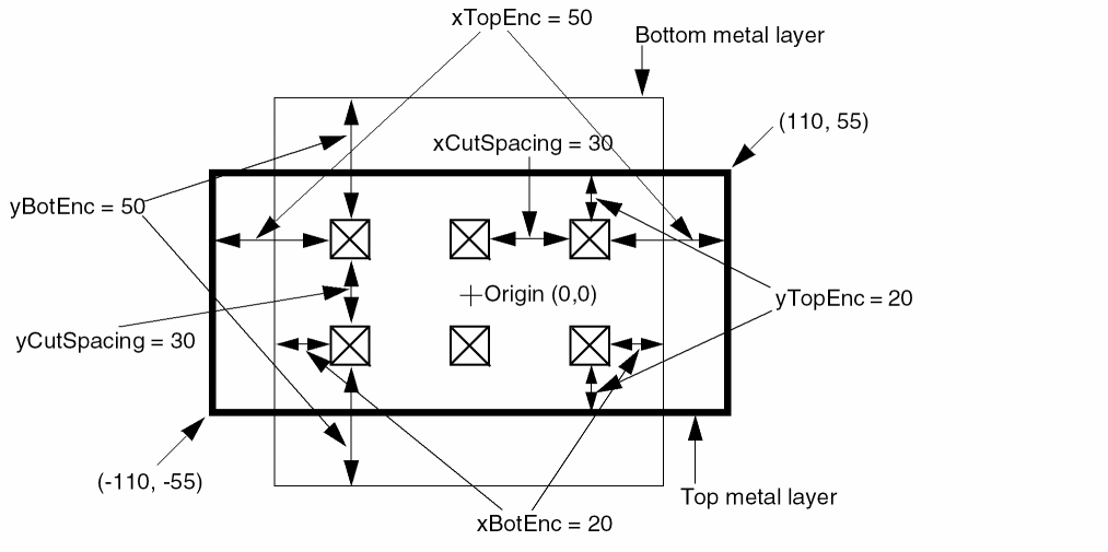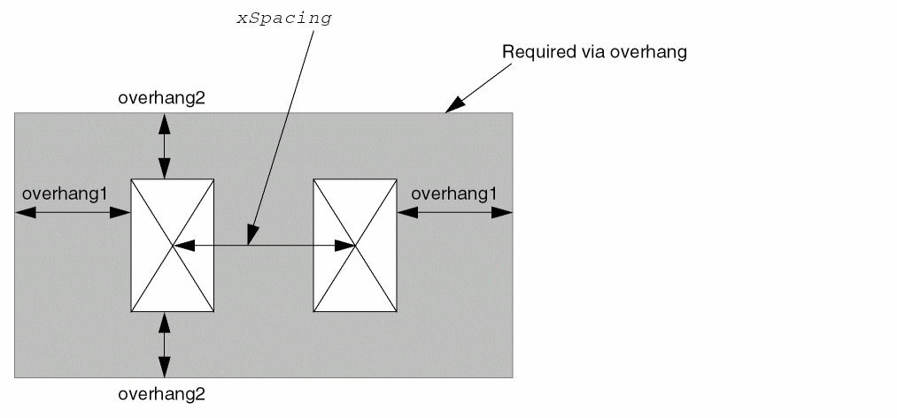 Specifies that the via must be covered by metal on two opposite sides by at least overhang1, and on the other two sides by at least overhang2 (see Figure 1-63). The via generation code then chooses the direction of overhang that best maximizes the number of cuts that can fit in the via.
