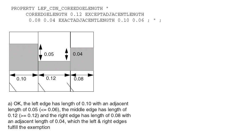 PROPERTY LEF_CDN_COREEDGELENGTH "COREEDGELENGTHminLength[EXCEPTADJACENTLENGTH {exactEdgeLengthadjLength[EXACTADJACENTLENGTH]}…] ; " ;